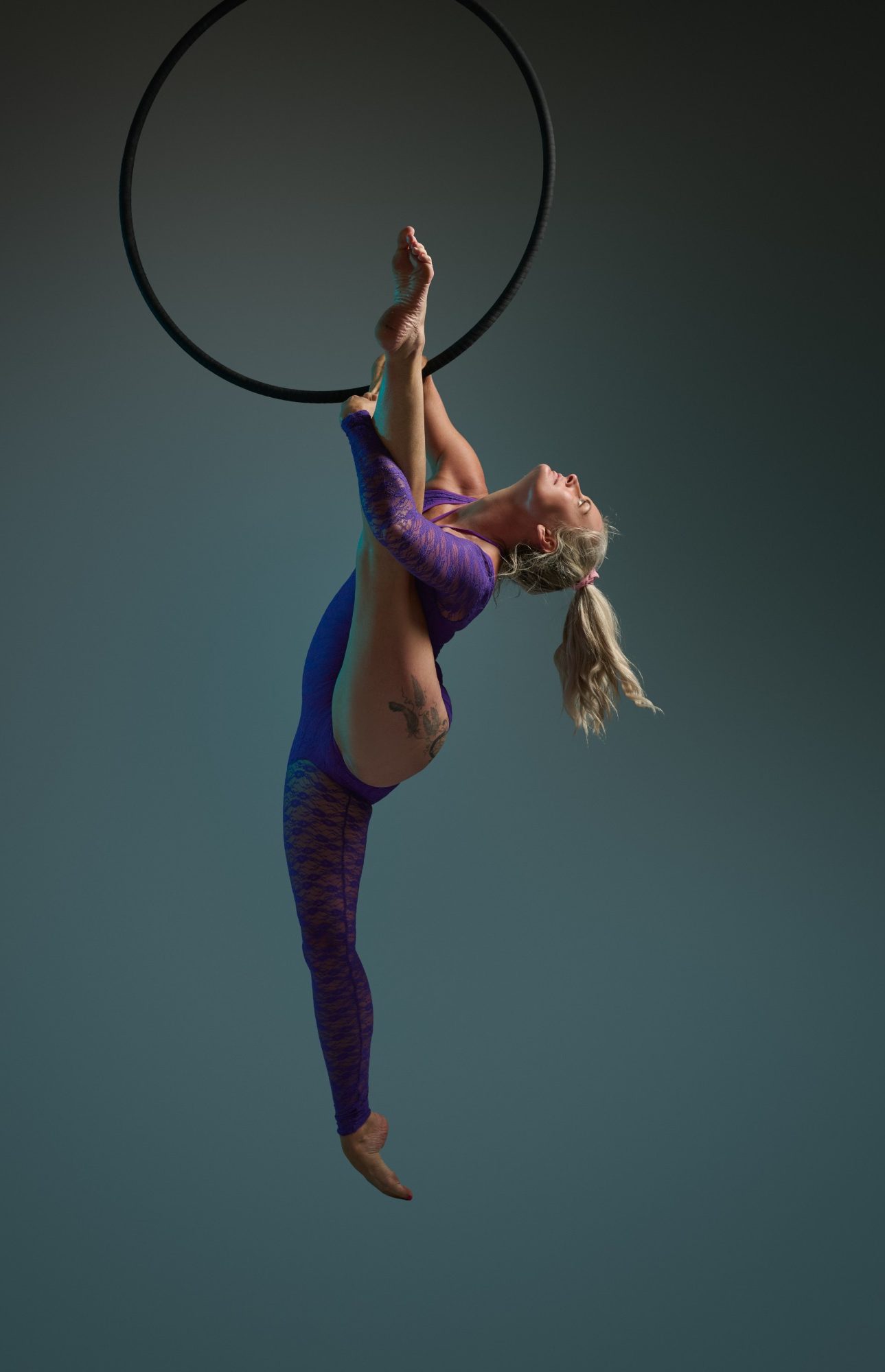 A metal hoop is suspended from the ceiling, we guide you through safe practice, spins and tricks from the bottom bar, in the hoop, and progressing to the top bar. With 1000's combinations and tricks to learn you'll never get bored!